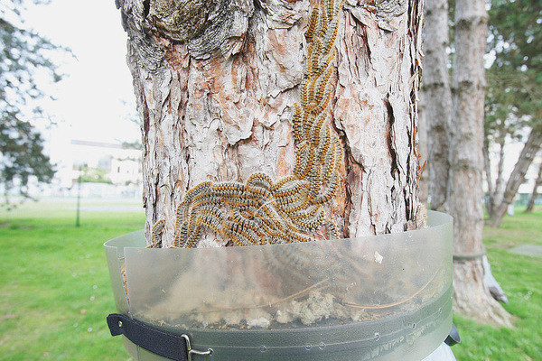 Piégeage des chenilles : Le but est d’intercepter les chenilles lorsqu’elles quittent leurs nids d’hiver pour s’enterrer dans le sol. Cela va permettre d’éviter les contacts humains ou animaux avec les poils urticants et également de réguler la prochaine génération. Le piégeage des chenilles va se faire de Février à Mai.